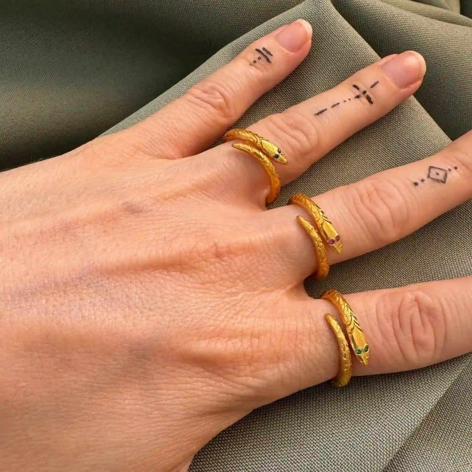 Our Adjustable Gold Snake Ring uniquely crafted to wrap your finger in the enchanting allure of a snake, adorned with a variety of captivating gemstone options to personalize your style. (Ruby, Sapphire, Emerald)